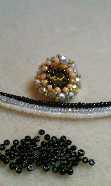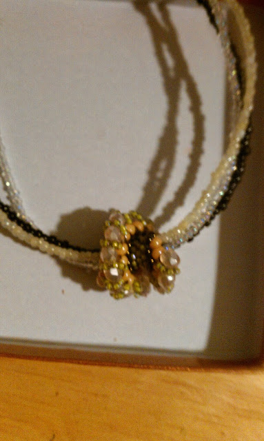 I started with Shirley's focal piece.  I wished I was able to do any of the beadweaving ropes as I thought that would have showed off the focal really well. Since I don't do beadweaving, I strung three different wires  with black, pearly white, and crystal faceted seed beads and then hung the focal from them.